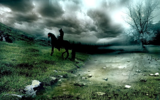 Nella steppa sconfinata il cavaliere senza volto cavalca il suo nero destriero.